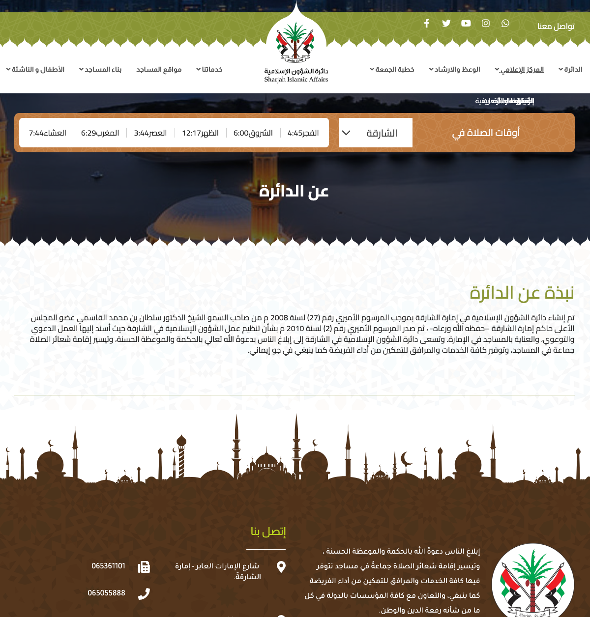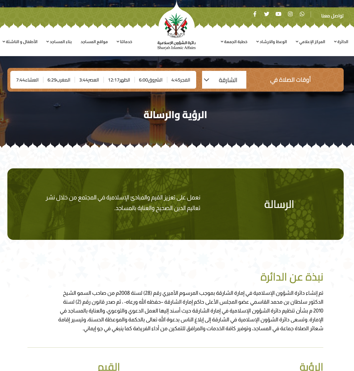 Overview: The Department of Islamic Affairs in the Emirate of Sharjah was established by Amiri Decree No. (27) of 2008, issued by His Highness Sheikh Dr. Sultan bin Muhammad Al Qasimi, Member of the Supreme Council and Ruler of Sharjah—may God protect and preserve him. Later, Amiri Decree No. (2) of 2010 was issued to regulate the work of Islamic Affairs in Sharjah, assigning it responsibilities for religious advocacy, awareness, and the care of mosques within the emirate. The Department of Islamic Affairs in Sharjah aims to convey the call of Allah with wisdom and good advice, facilitate the performance of congregational prayers in mosques, and provide all necessary services and facilities to enable the proper fulfillment of religious duties in a spiritually conducive environment.